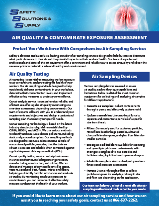 Safety Solutions and Supply supports our clients with various industrial hygiene sampling and occupational health services, including air quality assessments, sound surveys, contaminant samplings, and more. With the high potential of exposure to chemical and physical hazards in the workplace, worker protection should be a priority for any successful organization.